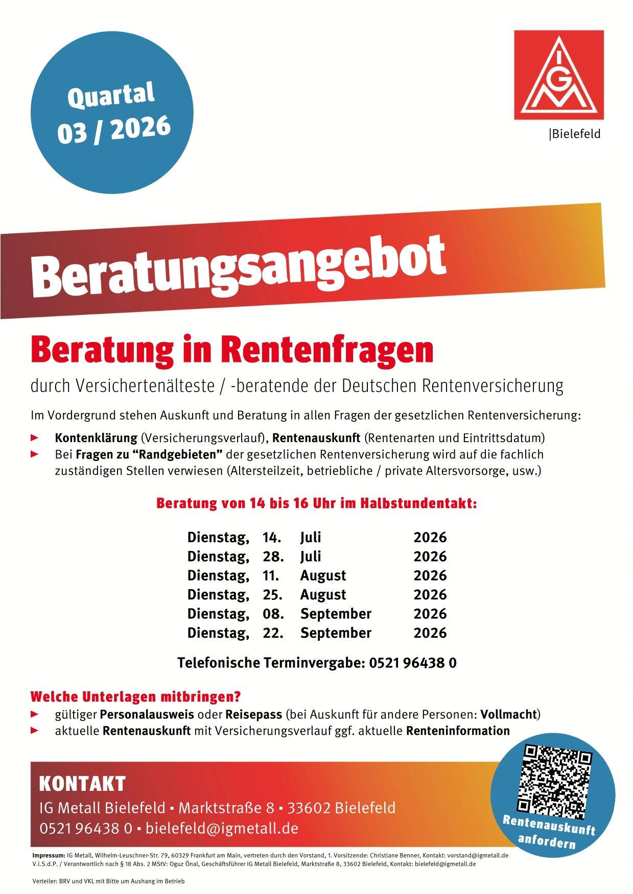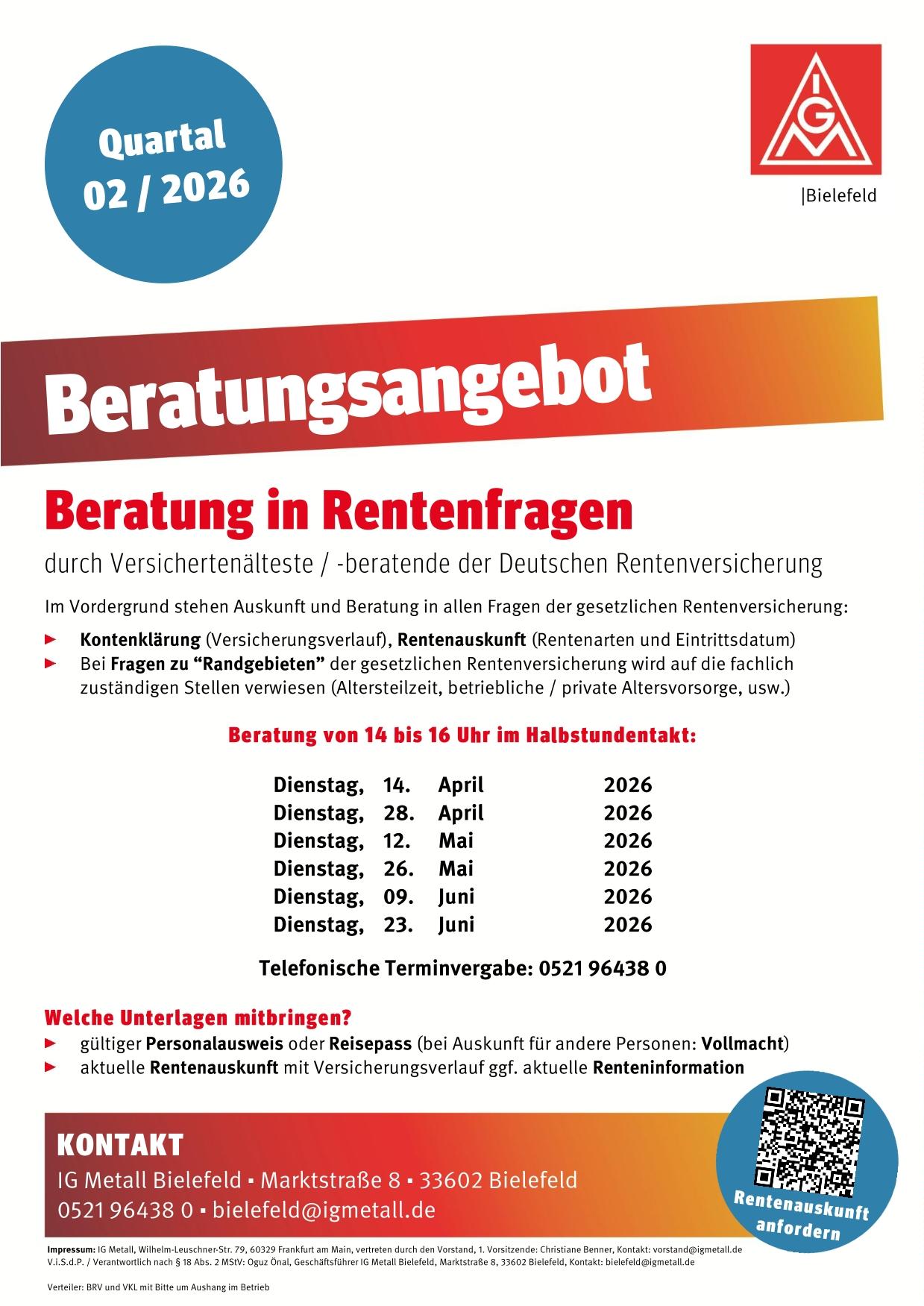 Die IG Metall Geschäftsstelle Bielefeld bietet regelmäßig Beratungstermine in Rentenfragen an. Hier können sich Mitglieder von den ehrenamtlichen Berater:innen helfen lassen.